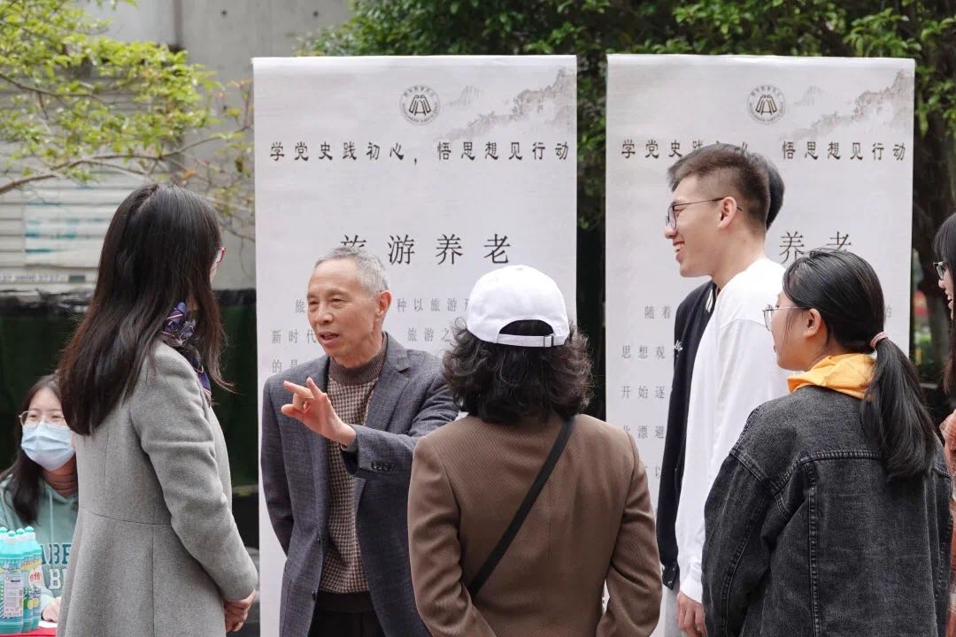 本次活动受到社区老年人群体的热烈欢迎,他们不仅认真倾听着学院师生的介绍,更是畅所欲言,提出自己的观点和想法。学院党委书记沈晓敏老师亲切地和老同志们交流讨论着近些年来养老形式的变化,教工第三党支部的几位专业老师也从社会保障专业的角度一一解答着老年的困惑。