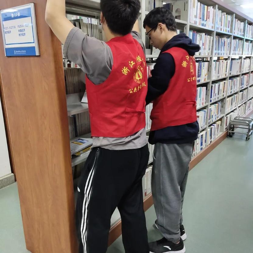 志愿者们将杂乱的书籍摆放整齐以保障来借阅图书的同学迅速能找到自己想要寻找的图书,为同学们营造一个整洁、舒适、文明的阅读和学习环境。