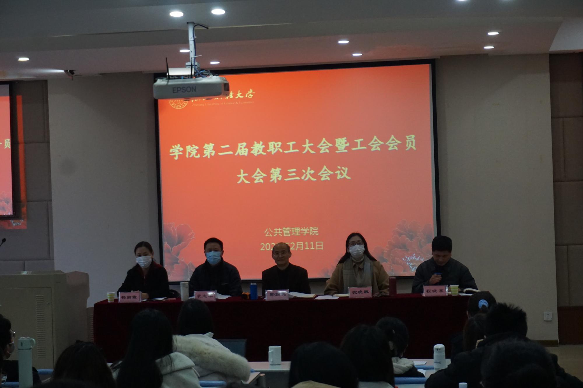第二届教职工大会暨工会会员大会第三次会议在208会议室隆重举行,学院领导班子及全体教职工出席大会。大会由院党委副书记程晓东主持,院党委书记沈晓敏致开幕词。