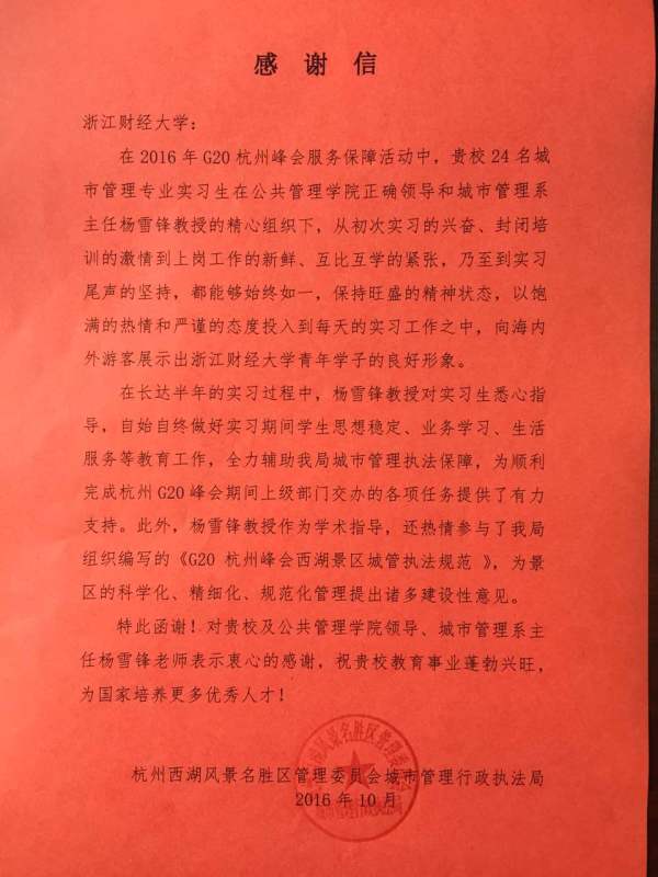 感谢信指出,我校选送的24名城市管理专业实习生以饱满的热情和严谨的态度投入到每天工作中,全力辅助城市管理执法保障,为顺利完成G20杭州峰会期间上级部门交办的各项任务提供了有力支持,向海内外游客展示了浙财学子的良好形象。执法局对学院领导的大力支持和城市管理系的精心组织表示衷心感谢,同时,也对av大平台
