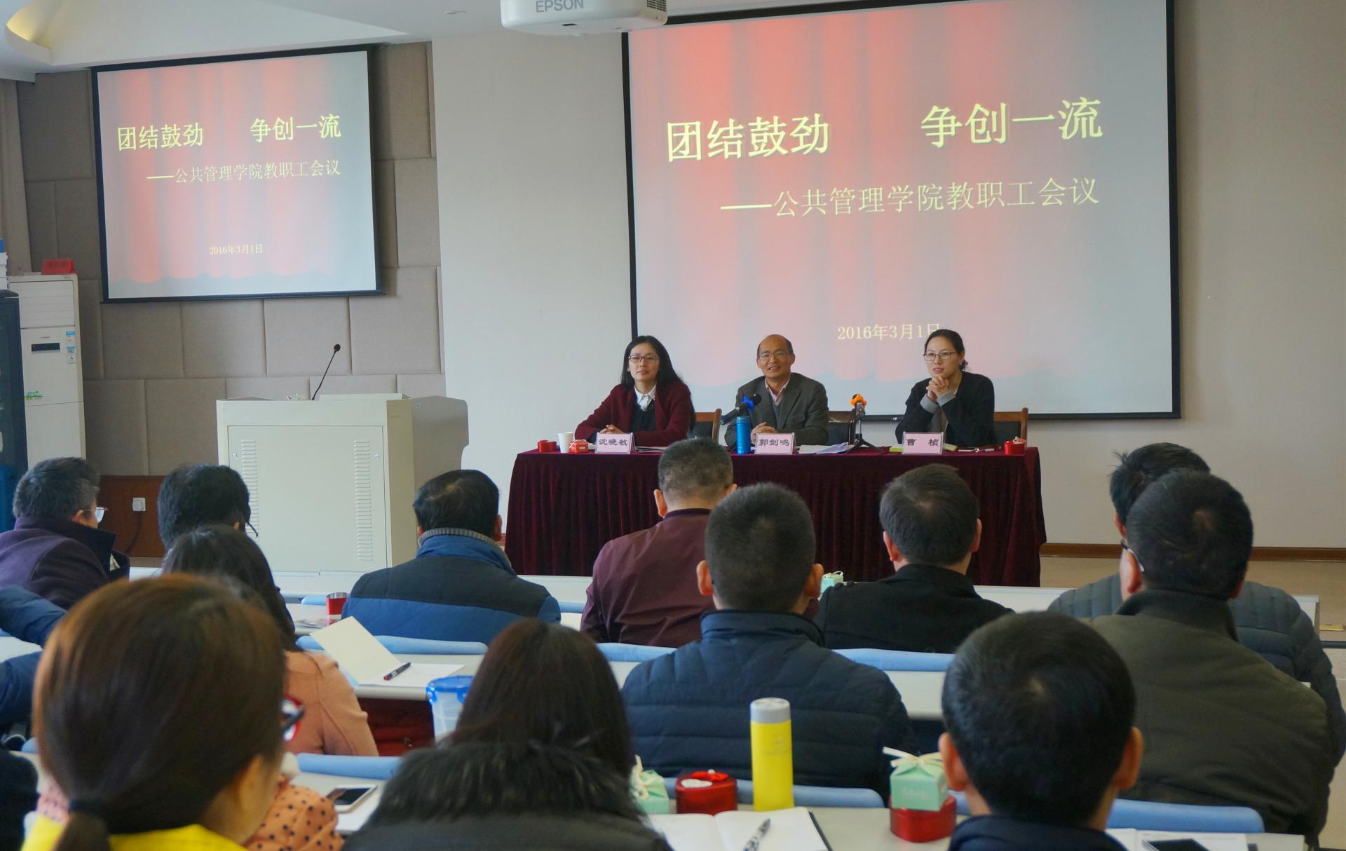 会上,院长郭剑鸣表达了对新学院未来的热切期待,提出了学院发展的初步构想和基本目标,动员全体教职工应团结共进,努力加强专业建设和学科建设,实现学院成为省属高校第一、成为浙江省乃至全国政府与城市治理研究的重要中心和人才培养基地之一的目标。他指出,学院虽然学科优势明显,科研实力较强,发展空间较大,但是仍然存在短板和不足。专业实力弱,高层次人才少,文化底子薄,校友资源短缺等问题,依然会桎梏学院今后的发展与腾飞。结合实际,郭剑鸣院长初步确定了“以人才培养为中心、学科建设为龙头、改革创新为路径、共享发展为动力”的指导思想,设想了“人才兴院、学科强院、合作富院”的发展战略,提出了涉及党建、人才培养、专业改造、学科建设、学院文化、校友合作等十个方面“补短板”的思路和举措。