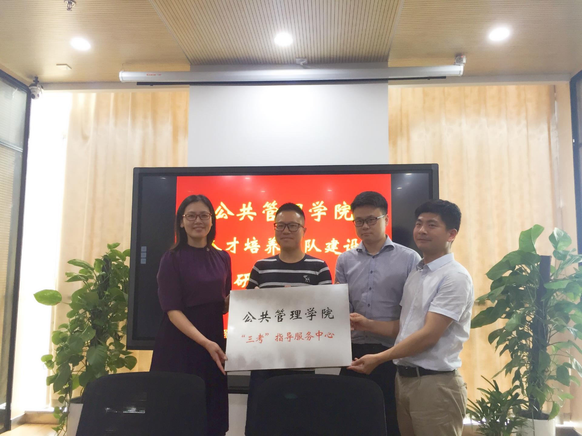 “三考”指导服务中心成立仪式暨人才培养团队建设研讨会在图书馆六楼举行。学院党委书记沈晓敏、副书记程晓东以及人才培养团队两个方向的教师代表参加会议。