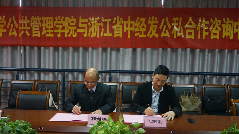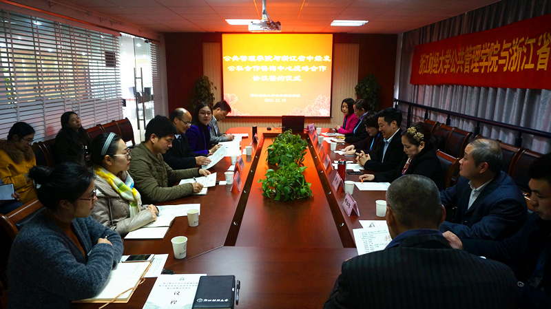 与浙江省中经发公私合作咨询中心战略合作签约仪式在1号学院楼517C会议室举行。中经发主任王前利、院长郭剑鸣、党委书记沈晓敏、党委副书记程晓东等双方主要领导出席了本次活动。仪式由沈晓敏主持。
