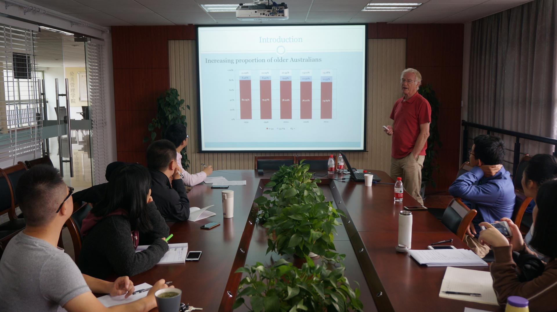 讲座交流。Martin Skitmore教授作了题为“Sustainable community for older people: case studies of green retirement villages in Australia”和“Writing English Journal Papers”两场报告。夏波博士参与了讲座讨论,分享了留学经历,并交流了澳大利亚硕博项目申请。