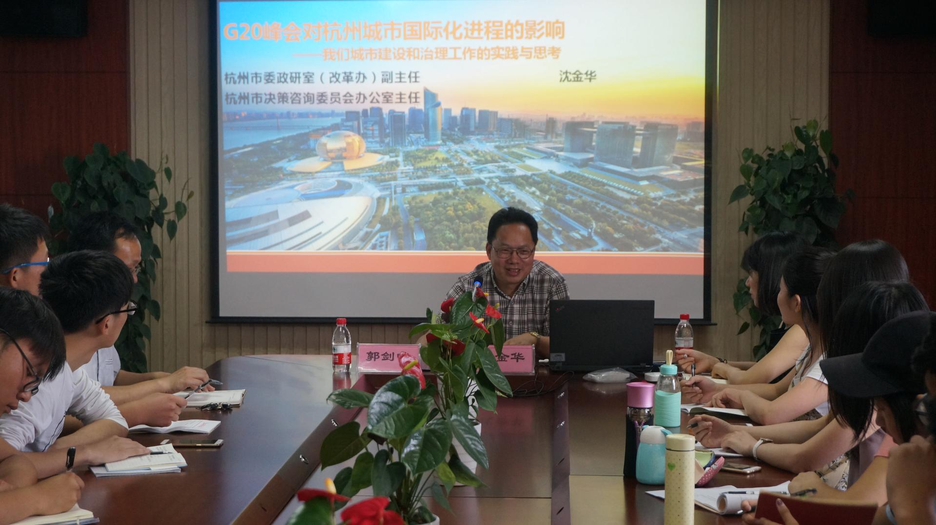 作了“后G20峰会时代,杭州走向国际化”的学术报告。讲座由院长郭剑鸣主持,相关专业教师、研究生和本科生代表参加。