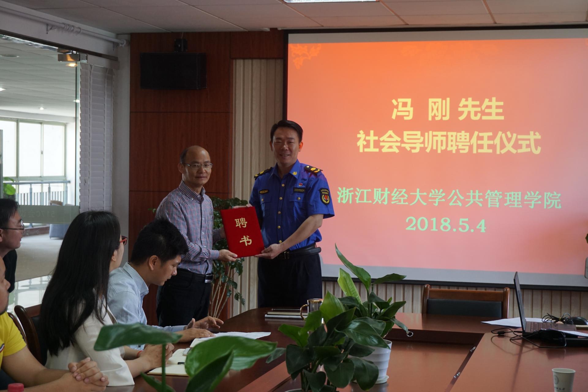 院长郭剑鸣为冯刚局长颁发社会导师聘书。作为学院社会导师(“双师”之一),冯刚从社会对城市管理队伍的认识谈起,介绍了成立西湖女子巡逻队、服务保障G20杭州峰会等背景,并着重介绍了“最美杭州人”西湖女子巡逻队的先进事迹,特别是“最美公务员”赵丹队长的感人事迹。