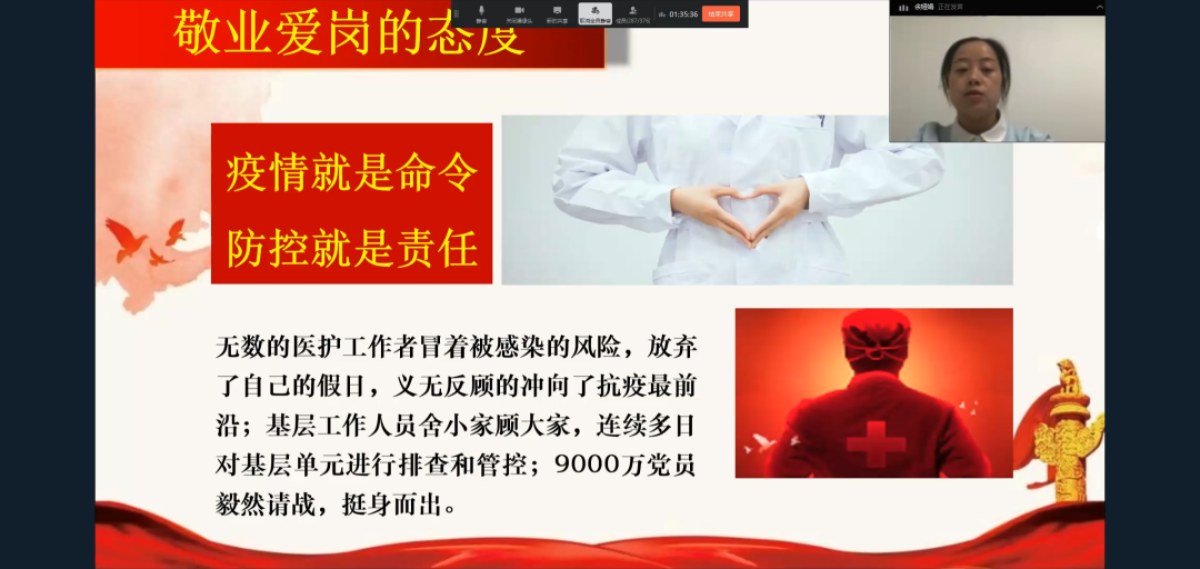 周静怡医生、余娅娟护士分享的抗“疫”经历,让人体会身临其境般的艰难险阻,在战“疫”一线与死神的生死搏斗,线上线下的师生深受感动。离别家人的不舍,搬运物资的艰辛,抗疫前线的困难,濒临崩溃时的相互鼓励,在她们的讲述中,一幅幅画面浮现在眼前。她们的先进事迹让更多师生知道了疫情中的“逆行者”也是平凡的普通人,也更加明白有一种爱叫作 “一方有难,八方支援”。从他们身上,体现出来的不仅有党员的使命担当,还有医护人员的敬业和奉献,值得我们所有人学习。