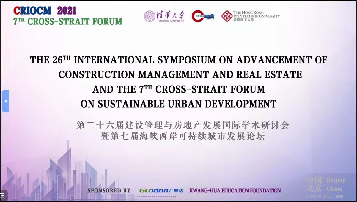 11月20日至11月21日,中华建设管理研究会(CRIOCM)与清华大学、香港理工大学联合主办的第二十六届建设管理与房地产发展国际学术研讨会(CRIOCM2021)暨第七届海峡两岸可持续城市发展论坛以线上会议的形式顺利举行,会议主题为“Innovation and Sustainability in Construction Management and Real Estate”。共有来自中国大陆、中国香港、英国、美国、澳大利亚、荷兰等地区两百多位学者参会研讨,五百多位观众收看研讨直播。av大平台