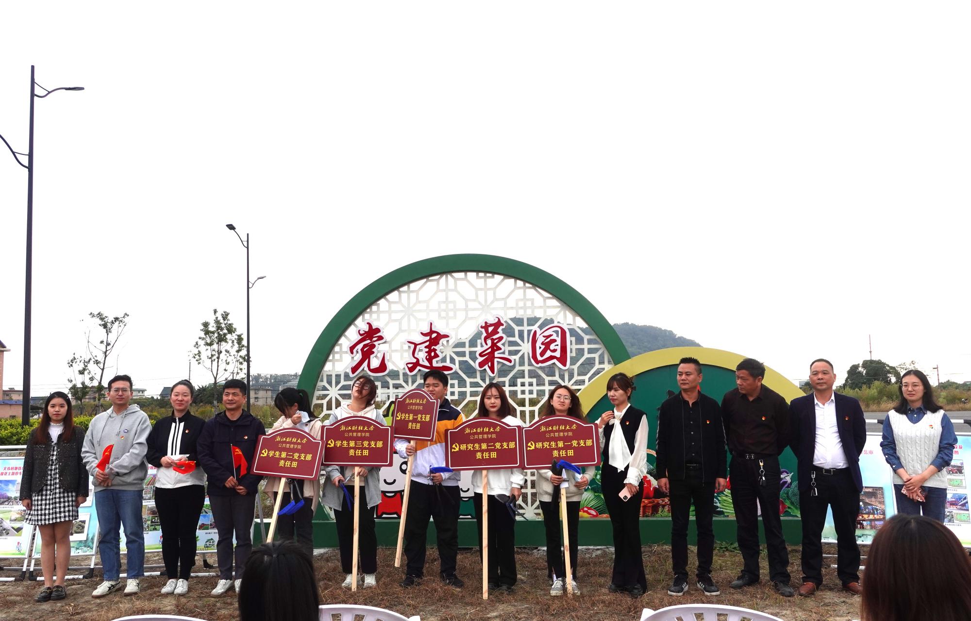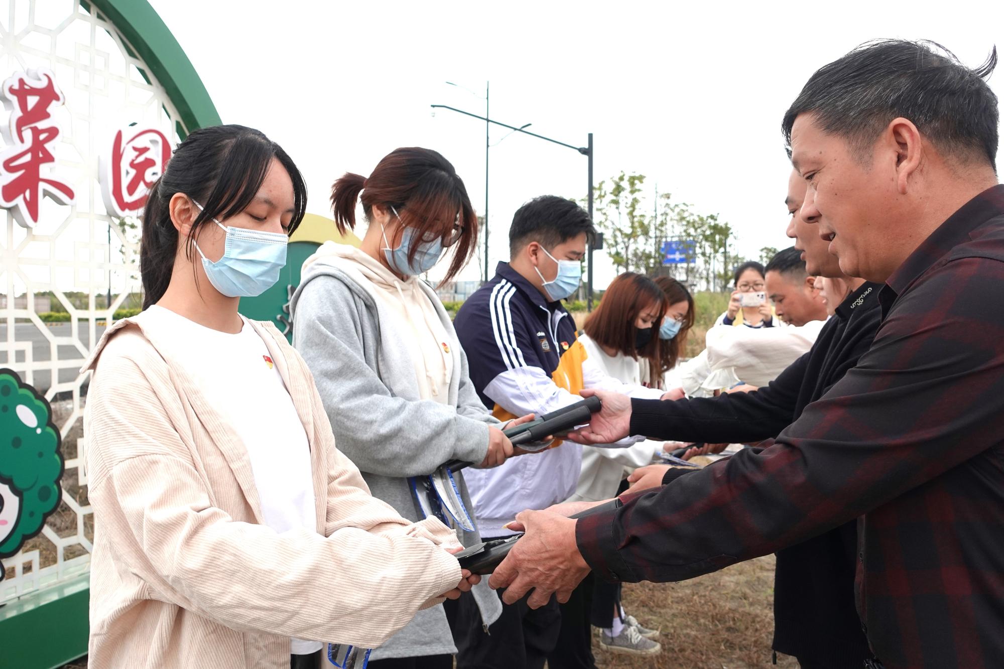 党课结束后,文伟村老党员手把手将农具交给各学生党支部代表,象征着红色精神从上一代向年轻一代的传承。各学生党支部按随机原则认领了各自的“责任田”,其中学生第一党支部、研究生第二党支部认领“党建菜园”菜地种植工作;学生第二党支部、学生第三党支部、研究生第一党支部认领“示范农田”稻谷收割工作。