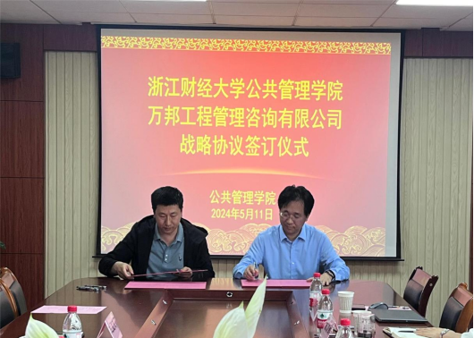 发展状况。王直民教授介绍了工程管理专业的发展情况,并阐述互利共赢的战略合作初衷。陈建华总经理对学院的热情接待表示感谢,并指出“人”是构建咨询企业核心竞争力的重要要素,万邦管理高度重视企业引才、育才、用才、留才工作,同时表达了通过校企合作实现共赢发展的美好意愿。双方就培养方向达成一致,共同签订战略合作协议,正式搭建起校企共建平台。