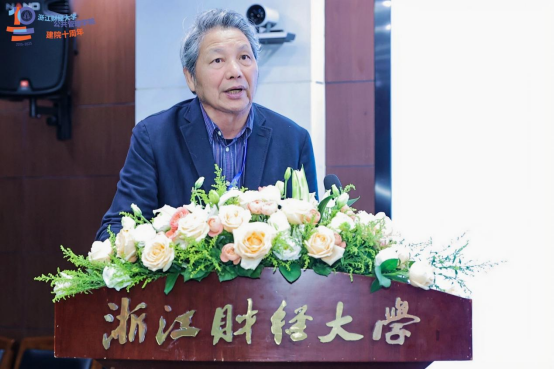 突出贡献奖”获得者颁奖,并授予名誉院长郭剑鸣“卓越贡献奖”,表彰郭剑鸣院长为学院发展做出的卓越贡献。郭剑鸣代表获奖教师发言,他表示学院十年发展得益于国家治理现代化的时代机遇、浙江创新的沃土和学校开放包容的领导们支持。衷心感谢公管学科评议组、教指委的引领,兄弟院校的倾囊相助,更离不开学院全体师生的艰苦努力。