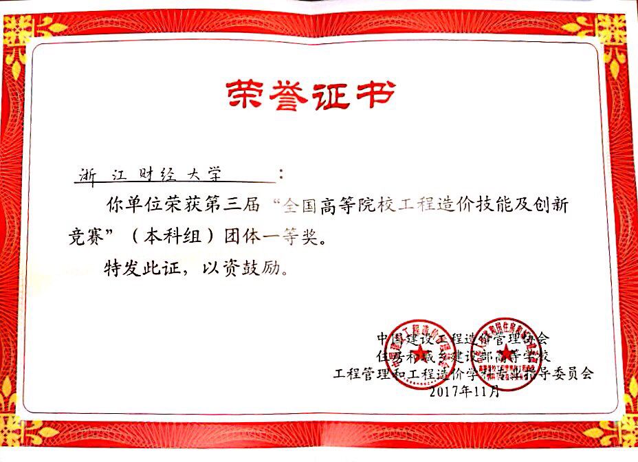 代表队,在吴慧、曾辉老师的指导下,经过为期一天共五轮的激烈角逐,最终脱颖而出,斩获本科组全国全能一等奖和手工计算建筑与装饰工程量专项一等奖。我校是参赛学校中唯一一所获得全能一等奖的财经院校,同时也是浙江省内唯一一所获得全能一等奖的院校,av大平台