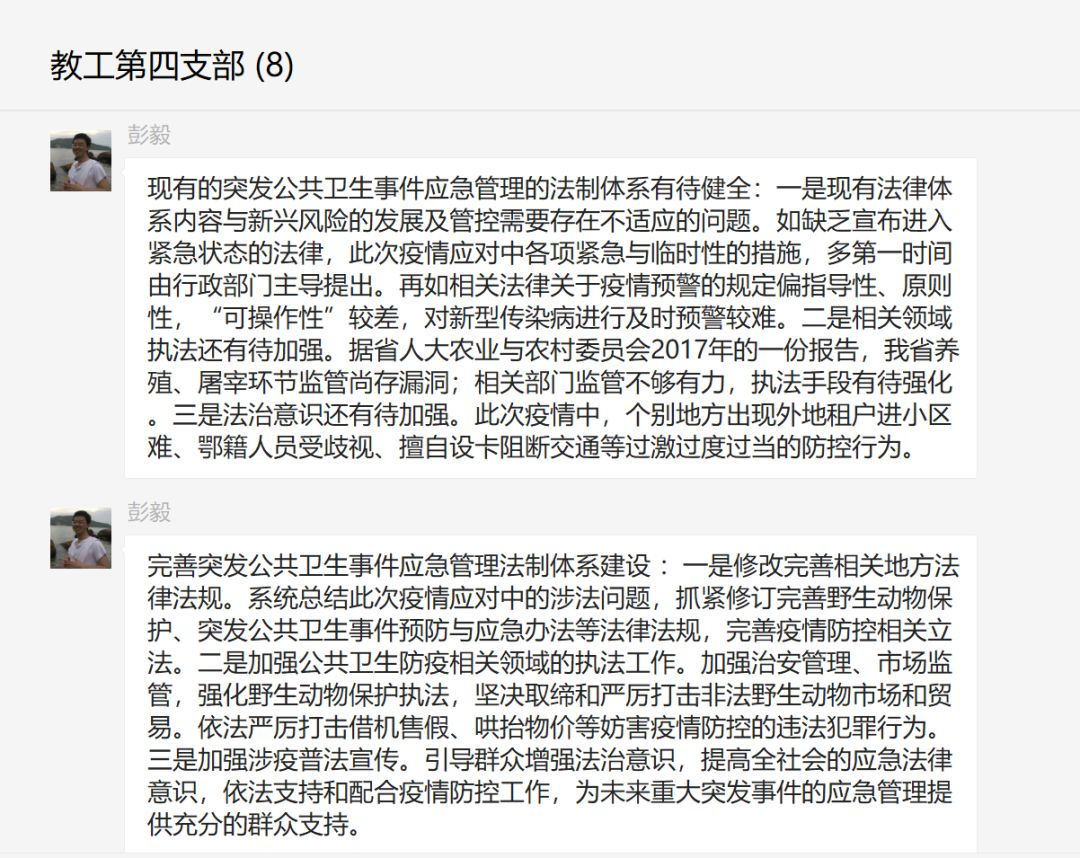 教工第四党支部召开“依法科学控疫情,统筹同心谋发展”主题党日活动。本次主题党日活动以线上微信沟通的方式在线参加会议,由蒋淑丽老师主持。到会7人,曾辉老师国外访学。