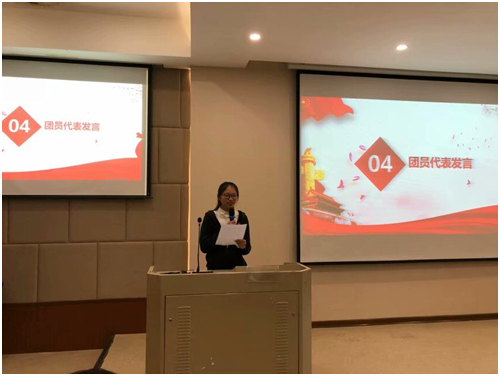 三、团员代表讲话:来自18公管3团支部的朱珠同学发表了“团员的责任与使命”发言。她回忆了自己刚入团时那庄严而又令人澎湃的场面,并且号召全体团员认真参加团员培训,学习政治理论。