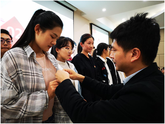 一、佩戴团徽:团徽是共青团员肩负革命重任的标志。开班仪式上,各班的团支书与副团支书作为团员代表上台,由学院党委副书记程晓东书记和辅导员张瑜老师为他们佩戴团徽。