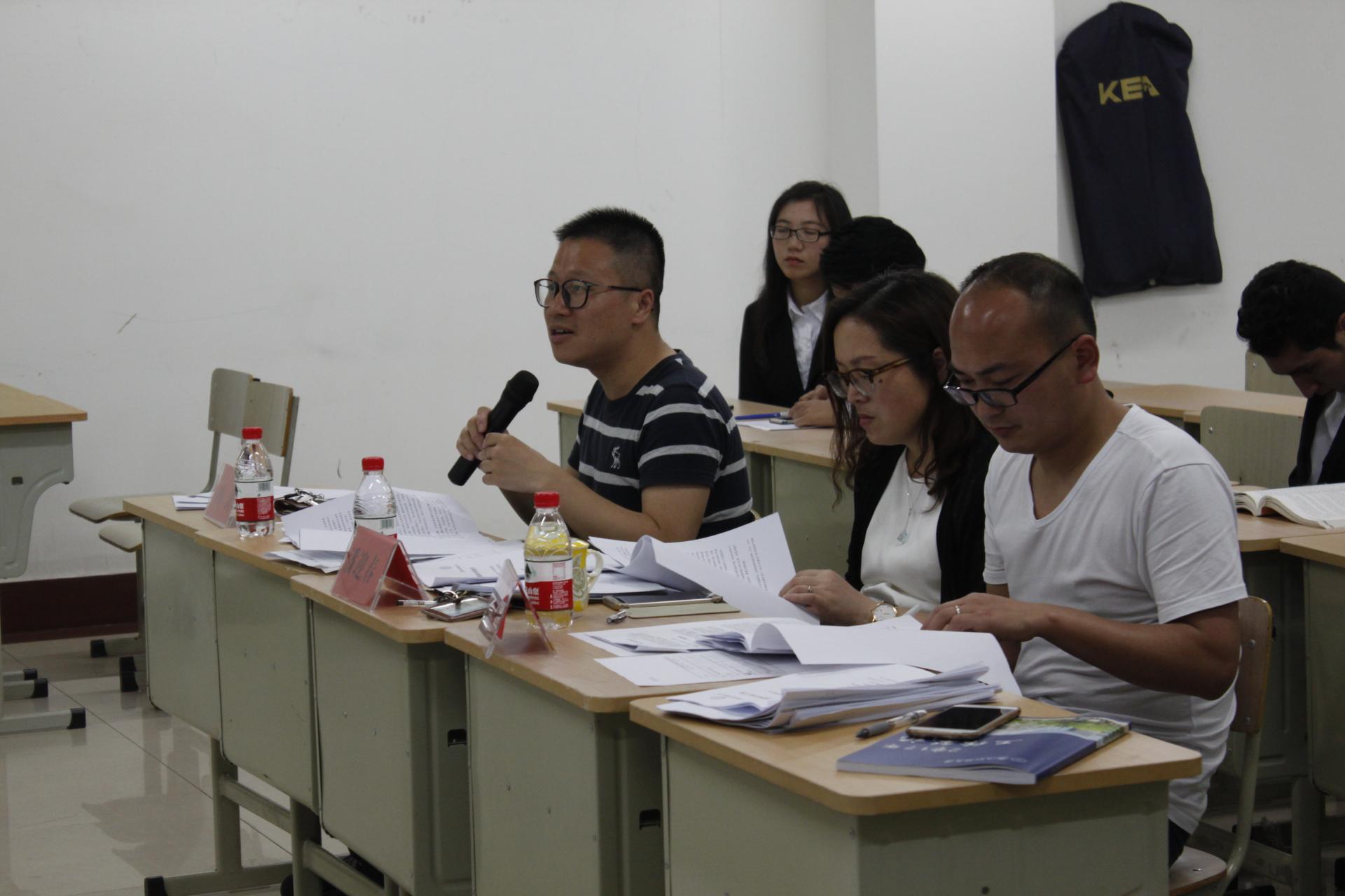 104教室正式拉开帷幕。行政管理系主任潘迎春、行政管理系专业老师冯涛以及科研秘书郭玉飞担任此次大赛的评委。