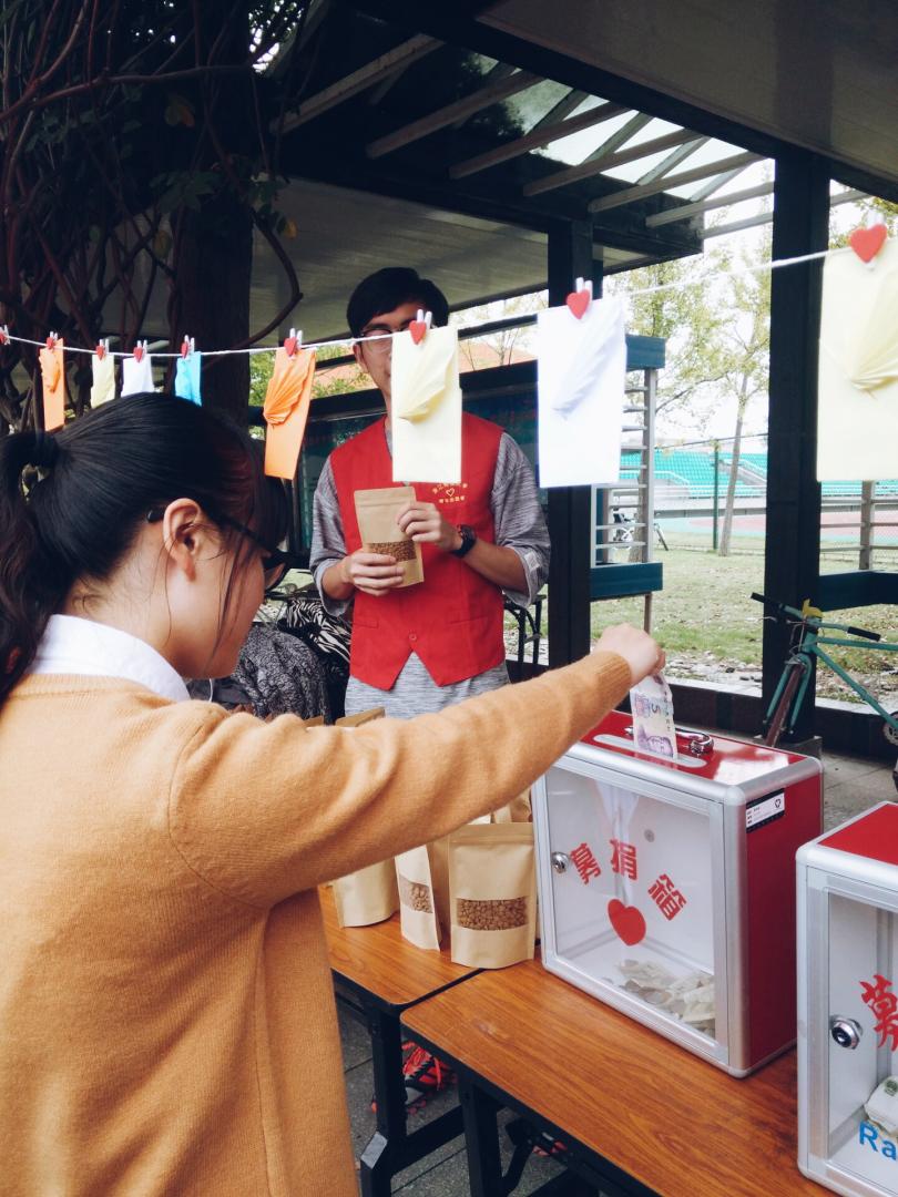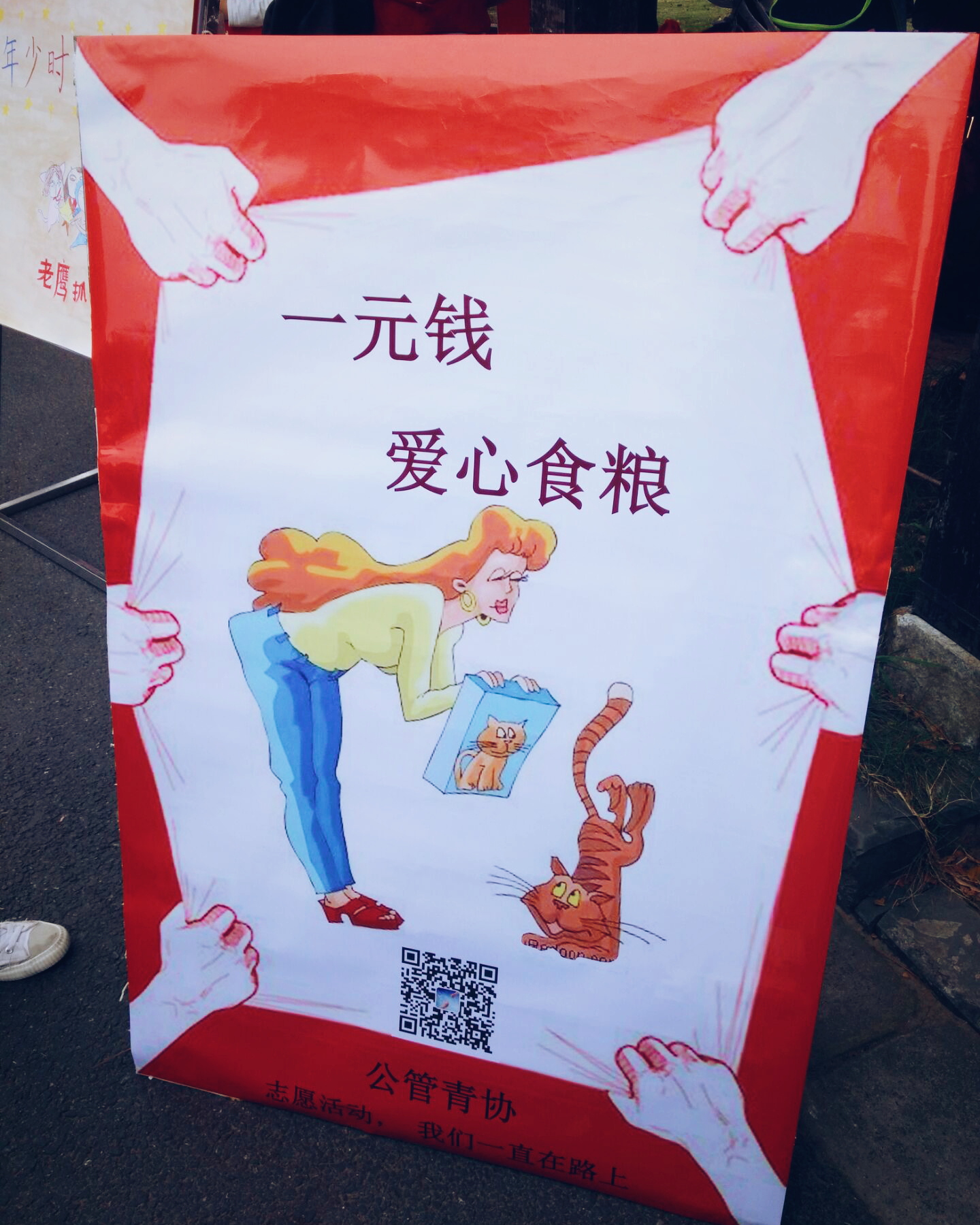 青协以关爱流浪小猫小狗为主题在文化长廊举办了"一元钱爱心食粮"活动。